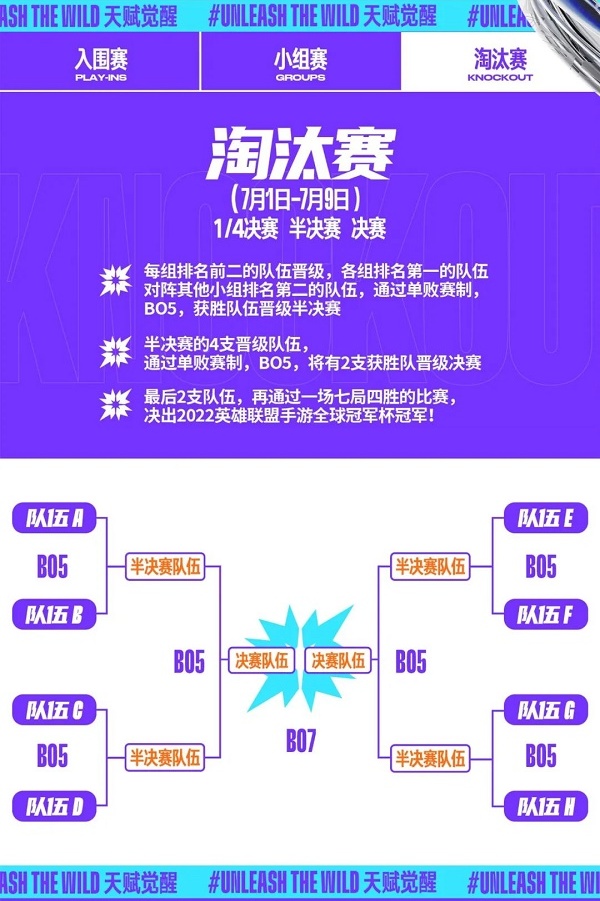 每组排名前二的球队晋级,每组排名第一的球队对阵其他小组排名第二的球队,通过单败赛制,BO5,获胜的球队晋级半决赛;