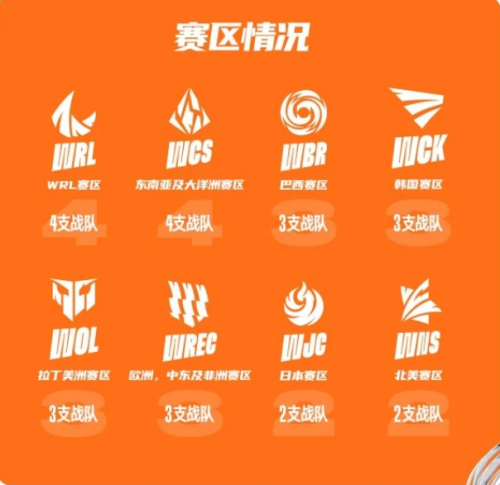 WRL赛区4支队伍,WCS东南亚和大洋洲赛区4支队伍,WBR巴西赛区3支队伍,WCK韩国赛区3支队伍,WOL拉丁美洲赛区3支队伍,WREC欧洲、中东和非洲赛区3支队伍,WJC日本赛区2支队伍,WNS北美赛区2支队伍。