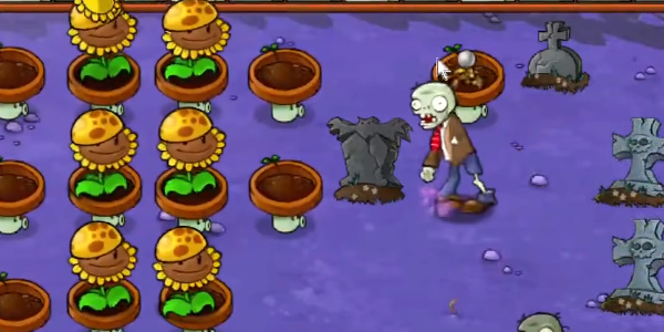 2、在早期阶段,我们继续把阳光放在向日葵上收集阳光。小盆蘑菇的伤害可以防止僵尸前进,然后用墓碑埋葬雷人来清理场上的墓碑。
