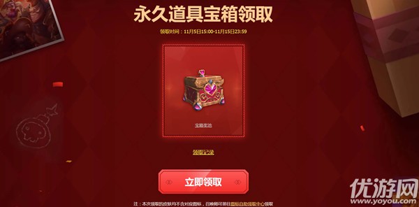 最近,英雄联盟开始了11月5日15日收到永久道具宝箱的活动:00-11月15日23:59。