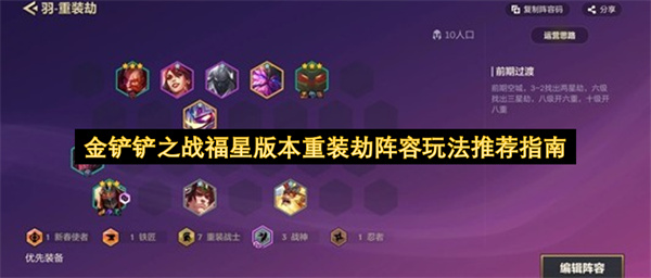 大家好,我是游戏老玩家,今天分享《金铲铲之战》福星版本中重装劫阵容的实战经验。这套阵容以天选重装劫为核心,前排堆肉拖住时间,劫切后排收割,操作简单,吃鸡率超高!